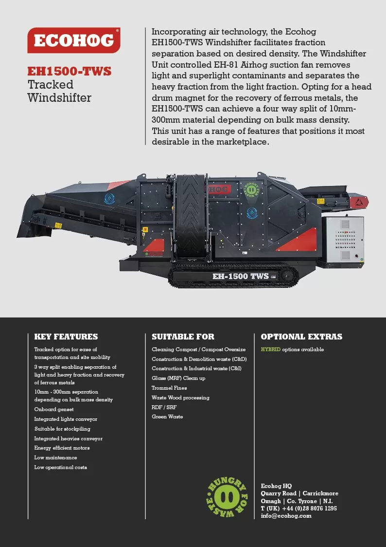 Incorporating the Ecohog Tracked Windshifter (EH1500-TWS) for your density separator needs will help you secure higher volumes of clean materials.
